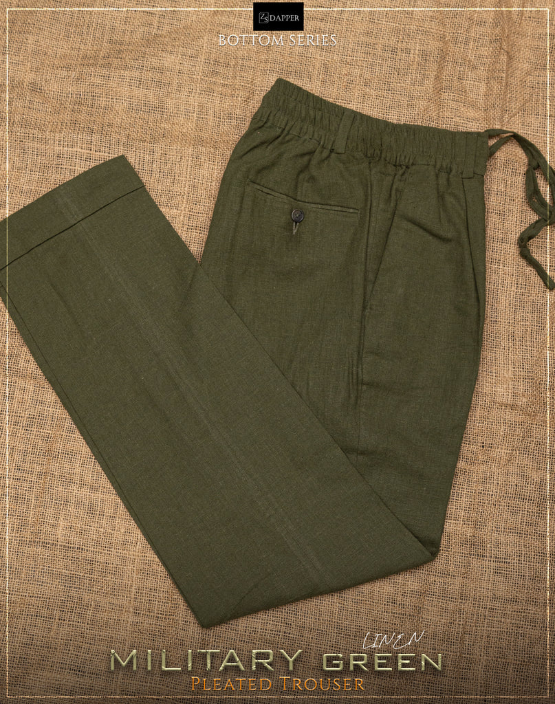 Military Green Linen Pleated Trouser ;